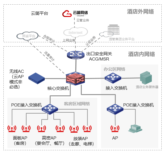 方案覆盖酒店内网络,并提供云简云管平台对酒店网络、安全设备统一纳管,酒店内网络是典型的接入和核心两层架构,自下而上包括AP、交换机、AC和出口网关四类设备,云简云管平台能够提供上述各类设备的常用可视化运维配置功能。